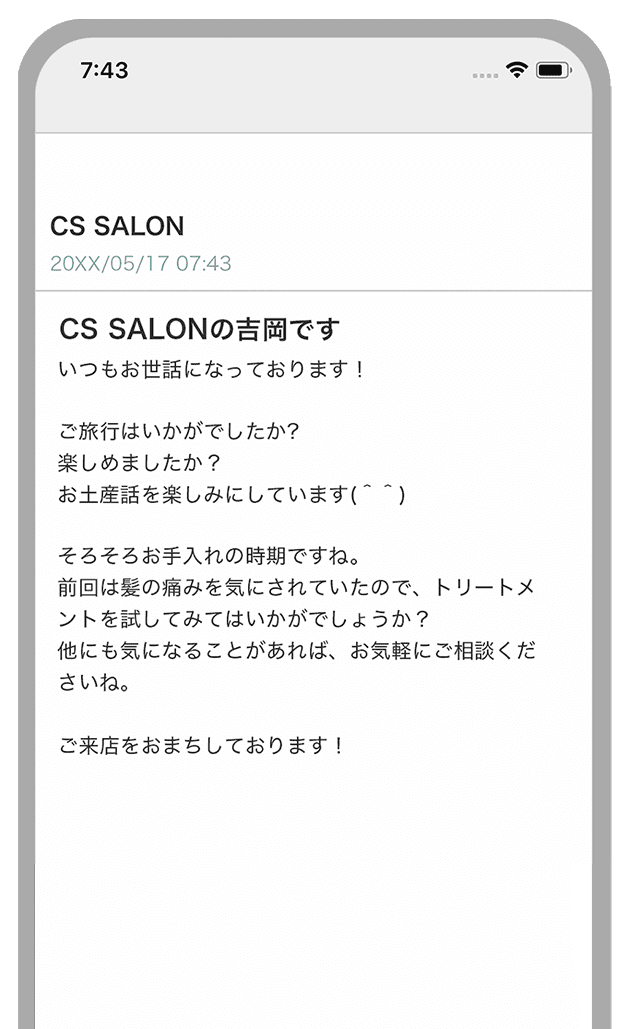 カミングメールは『coming-soon』の特許実績である来店予測に基づき、LINEやメールなどで送信されるお誘いメッセージです。単なる一斉配信とは異なり、最適なタイミングでお客様にアプローチし、来店を促します。