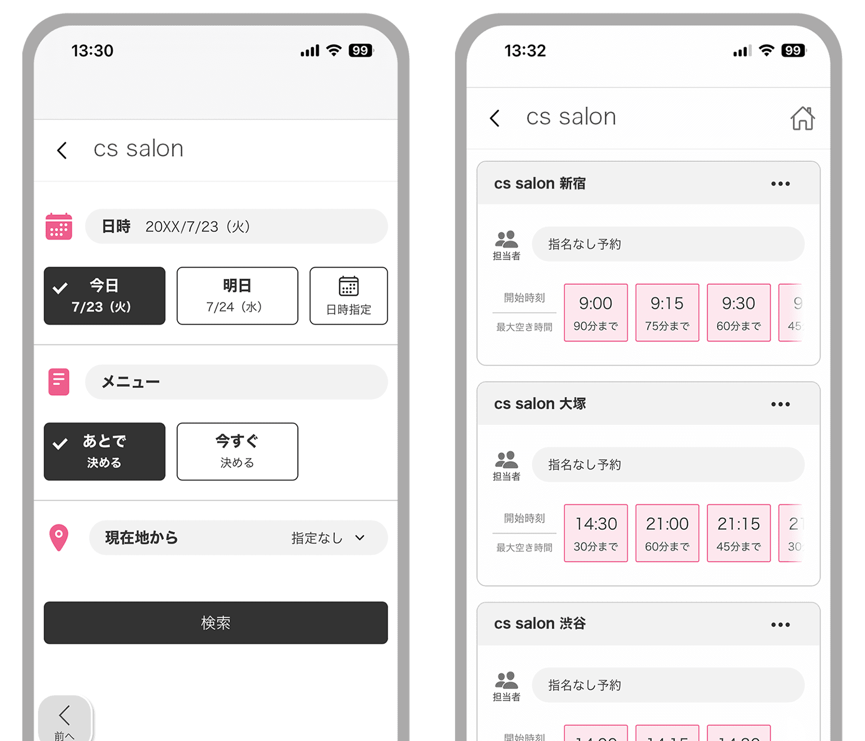 メニュー選択後に「希望する時間がない」という状況にならないよう、お客様の都合に合った空き状況を事前に確認でき、効率的に予約を進められます。