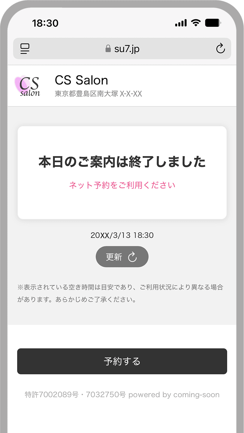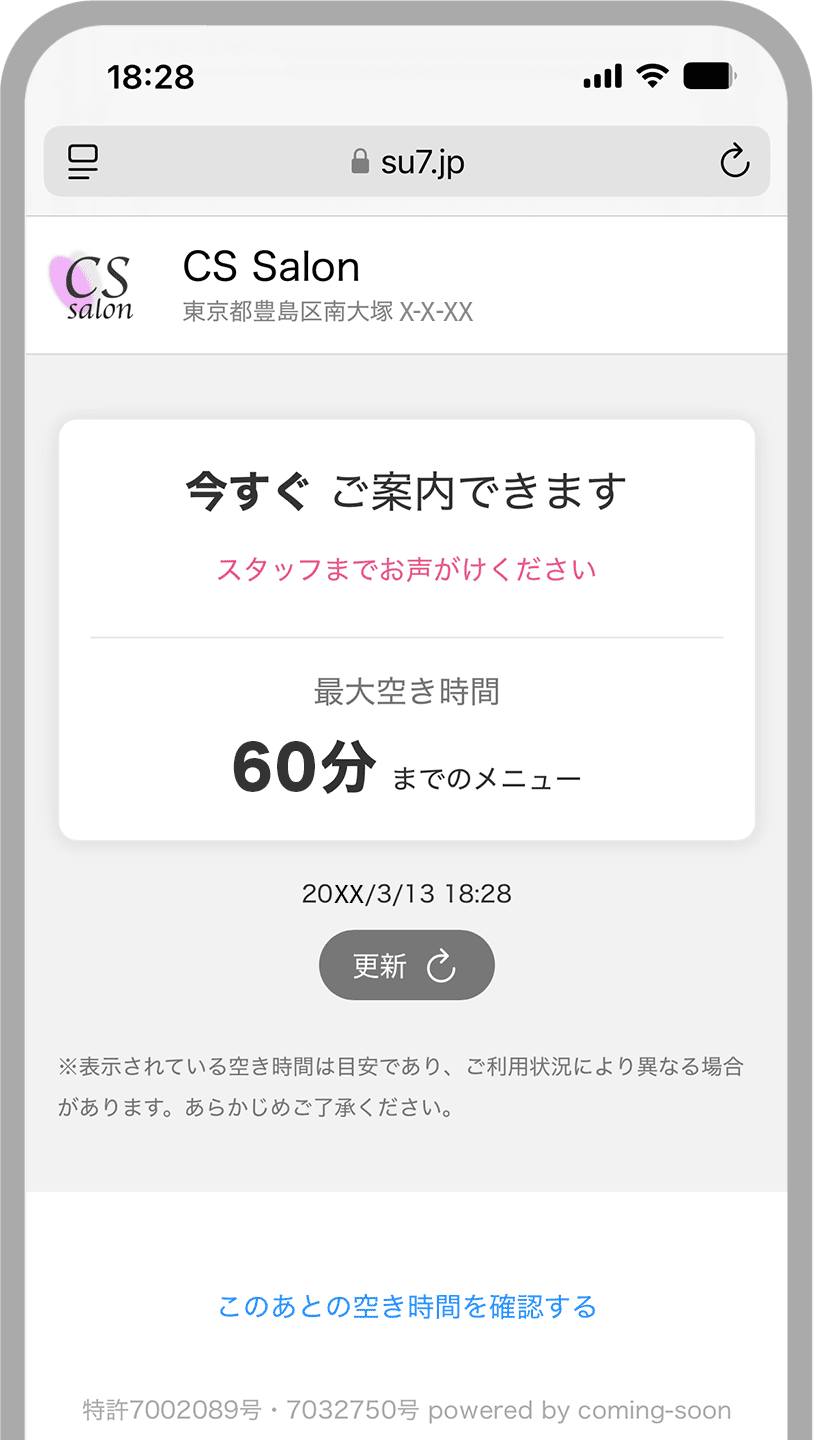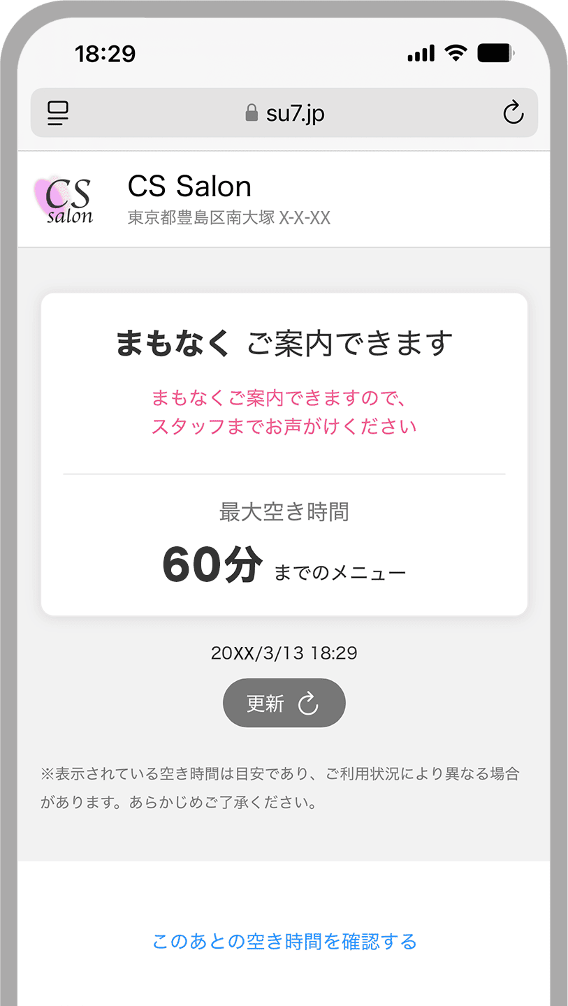 入店前に「今すぐ施術できるか」「満席なのか」がひと目で分かるため、スタッフに声をかける必要がなく、飛び込み来店の心理的ハードルを下げます。